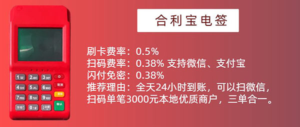 2.使用合寶pos機(jī)掃碼費(fèi)率為0.38%,不過(guò)這個(gè)0.38%需要支付在1000元以內(nèi)才是按照這個(gè)費(fèi)率標(biāo)準(zhǔn)進(jìn)行收取www.09847.com,超過(guò)的話就是按照正常的費(fèi)率進(jìn)行收取。