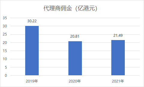 2021年度累計向代理商支付傭金約21.49億港元,該項支出同比增幅較平穩。
