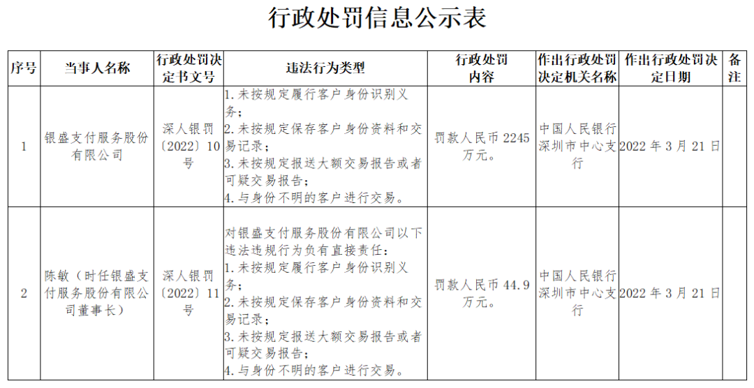 此外,行政處罰決定書(深人銀罰〔2022〕11號)顯示,時任銀盛支付服務股份有限公司董事長陳敏對上述違法違規行為負有直接責任,中國人民銀行深圳市中心支行2022年3月21日對其罰款人民幣44.9萬元。