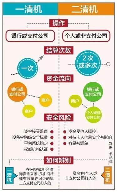 如今POS機銷售市場上帶一清機和二清機或是認為無卡支付,關鍵的差別就在刷卡消費清算階段,一清機在中國銀聯進行結算后,由金融機構或三方支付平臺立即清算資產到店家帳戶(收付款帳戶);而二清機在中國銀聯進行清算后,金融機構或三方支付平臺先將資產清算給某一企業賬戶或個人帳戶。