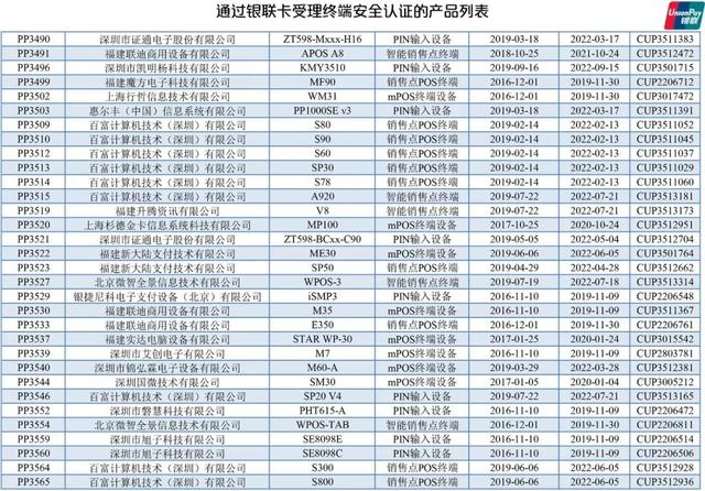 POS資訊 中國銀聯官網更新了【通過銀聯卡受理終端安全認證的產品列表】。銀聯卡受理終端設備指的是能完成銀聯卡交易的受理設備及其安全組件,包括但不限于電話支付終端、mPOS終端、金融自助終端,智能銷售點終端以及其他新型終端產品及PIN輸入設備等終端安全組件。