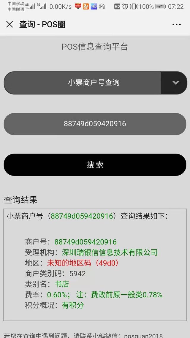 第三,微信關(guān)注POS支付網(wǎng),在查詢系統(tǒng)里選擇小票商戶號查詢,輸入商戶號,一目了然,虛假商戶會顯示紅色的 [未知的地區(qū)碼(49D0)],如下圖。
