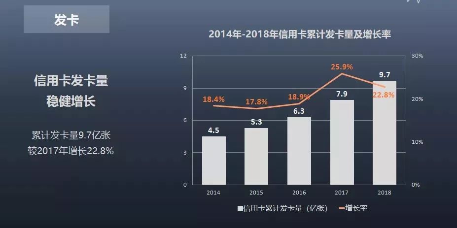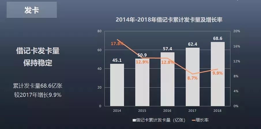 其中,信用卡累計發(fā)卡量為9.7億張,較2017 年底增長22.8%,信用卡人均持卡量為0.7張;借記卡累計發(fā)卡量為68.6億張,較2017年底增長9.9%,借記卡人均持卡量為4.92張。
