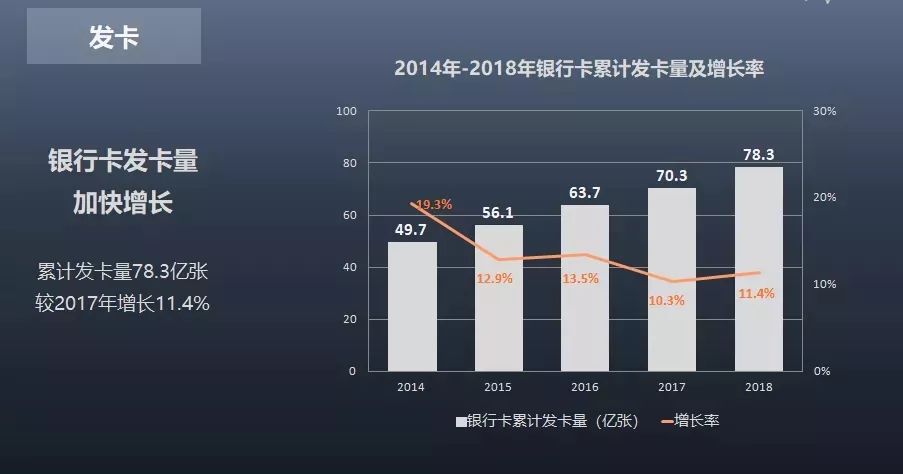 從發(fā)卡情況來看,截至2018年底,我國銀行卡累計發(fā)卡量為78.3億張。