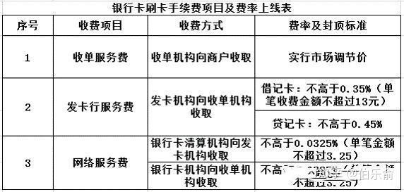上圖顯示的就是說國家發改委明文規定的關于pos機費率的分成形式,分別是發卡銀行、結算機構和三方支付平臺。發卡銀行就是說發給你借記卡(借記卡)或者信用卡(借記卡)的銀行,結算機構(中國銀聯和網聯平臺),三方支付平臺(第三方支付公司等)。信用卡手續費就是說由這三家分了,表里顯示的都比較清楚了。